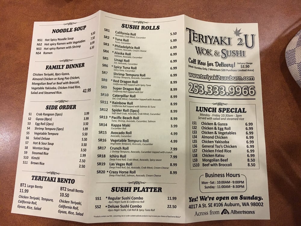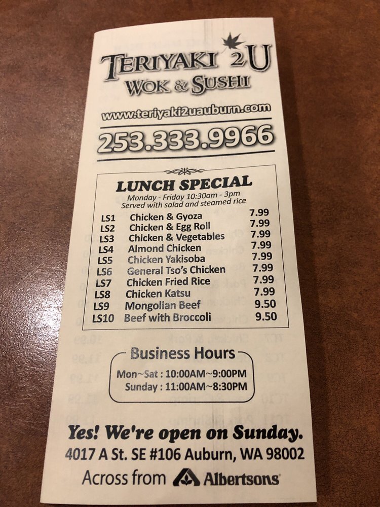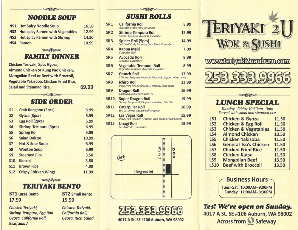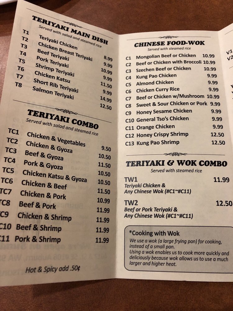 Introducing the menu at Teriyaki 2U, a Chinese - Japanese - Sushi Bars brand located in Auburn, WA. This casual restaurant offers a variety of options, including teriyaki main dishes like Teriyaki Chicken, Chicken Breast Teriyaki, Beef Teriyaki, and more. The Teriyaki Combo options allow for unique pairings like Chicken and Vegetables, Beef and Gyoza, and Chicken Katsu and Gyoza. Additionally, their Chinese Food-Wok menu features delicious dishes like Mongolian Beef, Kung Pao Chicken, and General Tso's Chicken. Customers praise the generous portions, friendly service, and variety of dishes offered. With vegan and vegetarian options available, Teriyaki 2U is a great choice for a casual bite with friends and family. Don't miss out on trying their flavorful and satisfying teriyaki combinations!