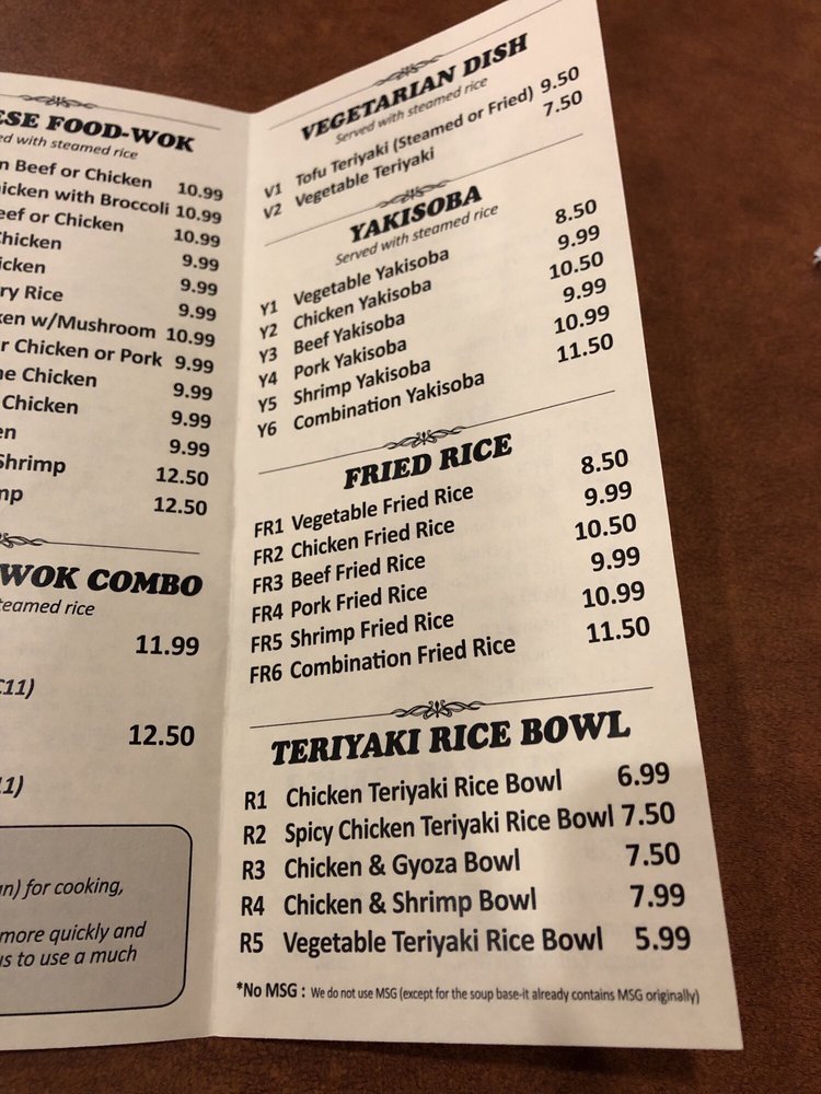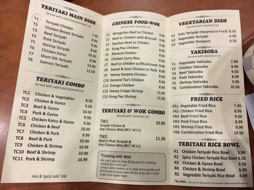 Chicken teriyaki, 8 pieces gyoza, almond chicken or kung pao chicken, Mongolian beef or beef with broccoli, vegetable yakisoba, chicken friced rice, salad and steamed rice.